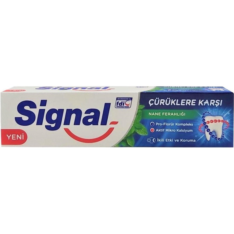 خمیر دندان مدل Curuklere Karsi سیگنال، حاوی عصاره سیب، نعناع و فلوراید و کلسیم است که به از بین بردن بوی بد دهان کمک میکند. از ویژگیهای این خمیردندان میتوان به محافظت از لثه، کمک به تقویت مینای دندان و کمک به سفید کنندگی دندانها اشاره کرد.