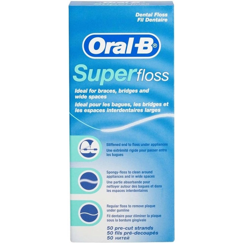 نخ دندان اورال بی مدل super floss حاوی عصاره طراوت بخش و خنک کننده نعناع می باشد که موجب خوشبو شدن دهان می شود همچنین حاوی 50 رشته نخ دندان با اندازه یکسان است که جهت استفاده راحت و آسان طراحی شده است. این محصول بسیار مقاوم می باشد و جهت استفاده دندان های ارتودنسی شده ایده آل است. از آنجا که محل های گیر کردن مواد غذایی در دهان به دلیل وجود سیم و براکت ها بیشتر است و دندان ها زودتر دچار پوسیدگی می شوند مدل super floss با سه ویژگی منحصر به فرد که دارای یک انتهای محکم و سخت، یک قسمت میانی اسفنجی و یک انتهای نخ معمولی است؛ فضاهای باز بین دندانی، براکت ها و بریجها و سیم ارتودنسی را به طور کامل تمیز می کند.