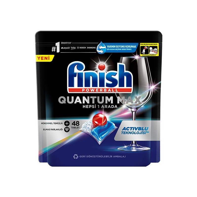 این قرص دارای سه رنگ قرمز، سفید و آبی می باشد که هریک از این رنگ ها در عملکرد شست و شو کاربر خاصی دارد.این قرص با رایحه لیمو می باشد لایه قرمز و کوچکی که در قرص مدل Quantum Max فینیش وجود دارد هنگام شست و شوی ظروف به جلادهنگی بیشتر کمک خواهد کرد. لایه سفید به کار رفته در این قرص نیز از فرمولاسیون ویژه ای برخوردار است. به این صورت که در هنگام شست و شوی ظرف ها با تولید اکسیژن بیشتر کمک می کند تا چربی موجود روی ظرف حل شده و شست شوی آن ها به راحتی صورت گیرد. 30 درصد از این قرص برای شست و شو و مابقی آن برای آبکشی مورد استفاده قرار می گیرد. در قرص Finish مدل Quantum Max یک لایه آبی هم وجود دارد که به شست و شوی بهتر ظروف کمک خواهد کرد. این نوع از قرص ها قدرت تمیز کنندگی فوق العاده ای دارند و کمک می کنند ظروف مختلف بخصوص ظرف های بلور و شیشه ای بدون هیچ نوع لکه ای شسته شوند و بدرخشند. از دیگر ویژگی های قرص ماشین ظرفشویی فینیش می توان به جلوگیری از ایجاد جرم در ماشین ظرفشویی و محافظت از فیلتر دستگاه اشاره کرد. همچنین قرص های فینیش در دمای پایین آب نیز اثرگذاری بالایی داشته و پس از شست و شو نیز به خشک شدن سریع ظرف ها کمک می کند. قرص های فینیش در بسته بندی هایی با تعداد مختلف تولید شده اند که می توانید با توجه به میزان نیاز خود خریداری کنید.