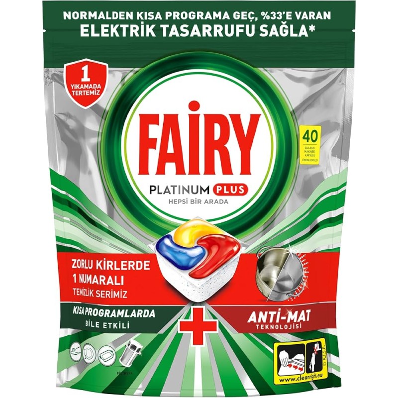 قرص ماشین ظرفشویی فیری مدل PLATINUM PLUS بسته 40 عددی با تکنولوژی ANTI-MAT علاوه بر اینکه باقیمانده مواد غذایی را به طور کامل تمیز می کند؛ ظاهر مات و کدر ظروف که در طول زمان به وجود می آید را برطرف می کند و باعث براق و درخشان شدن قابلمه، ماهیتابه، قاشق و چنگال و لیوان ها مانند روز اول می شود. این محصول با فرمولاسیون فاقد فسفات و قدرت تمیز کنندگی بالا نیاز به خیساندن ظرف ها را از بین می برد و به صرفه جویی در مصرف آب کمک می کند.